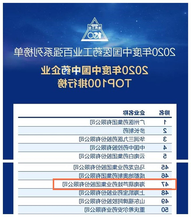 药业集团百尺杠头更进一步,位列中国中药企业TOP100排行榜第47位,连续第二年入围中国中药企业50强。